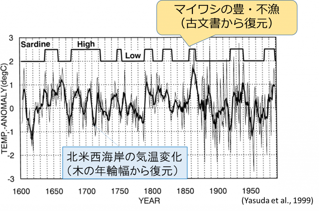 日本人はマイワシを新石器時代から食べており、1500年代以降はイワシ漁の豊凶を、古文書を調べることで推測できます。