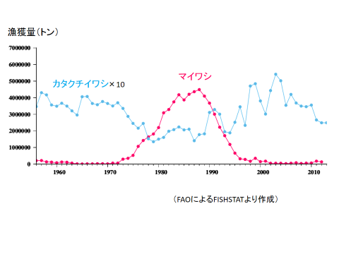 (※近年は、主に海洋環境の変化によってイワシの資源変動は引き起こされており、海洋環境に対する応答性がマイワシとカタクチイワシで異なるため魚種交替が起きるのだ、という説が有力です。しかし、海洋環境がイワシの増減にどう影響するのか、その仕組みについては研究がなかなか進まず、よくわかっておりません。環境変化以外のものが主因だとする説もあります。)