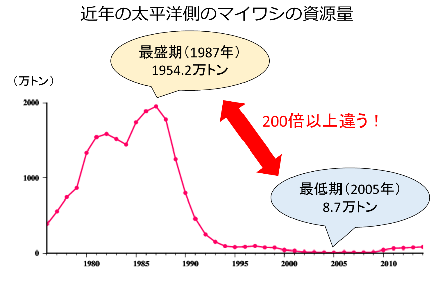 例えば日本近海の太平洋側に生息するマイワシの近年の資源量の変動を見てみると、最も少ない2005年は、最も多い1987年の0.5%以下の量しかありません。20年のうちに桁が二つ三つ変わるというような、凄まじい変化が起こりうるのです。