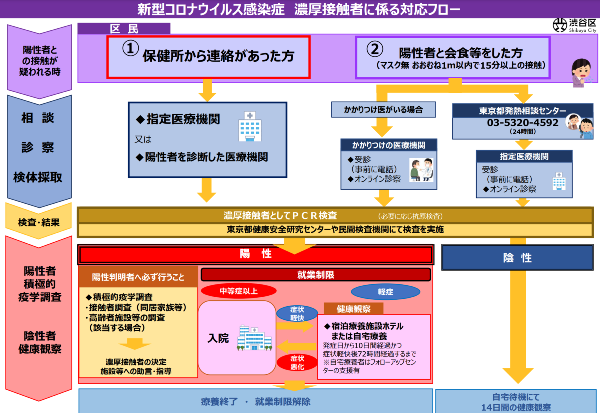 これは濃厚接触者向けのものになるので厳密には私の場合とは違うのですが、陽性者との接触があり、かつ症状が出ていることを考えれば、これに沿って対応すれば良さそうです。
