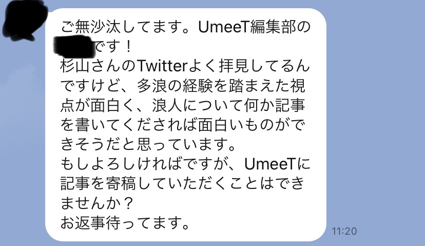 その際は対談内容が余りに常人の理解を(悪い意味で)超えた物だった為UmeeTの方に多大なご迷惑をお掛けしたので、企画を考案した戦犯の私はもう2度とUmeeTには仕事させて貰えんな、と思っていたのですが、先日遊園地のメリーゴーランドでワチャワチャ遊んでいたら記事を書いてくれた方からこんなラインが来ました↓
