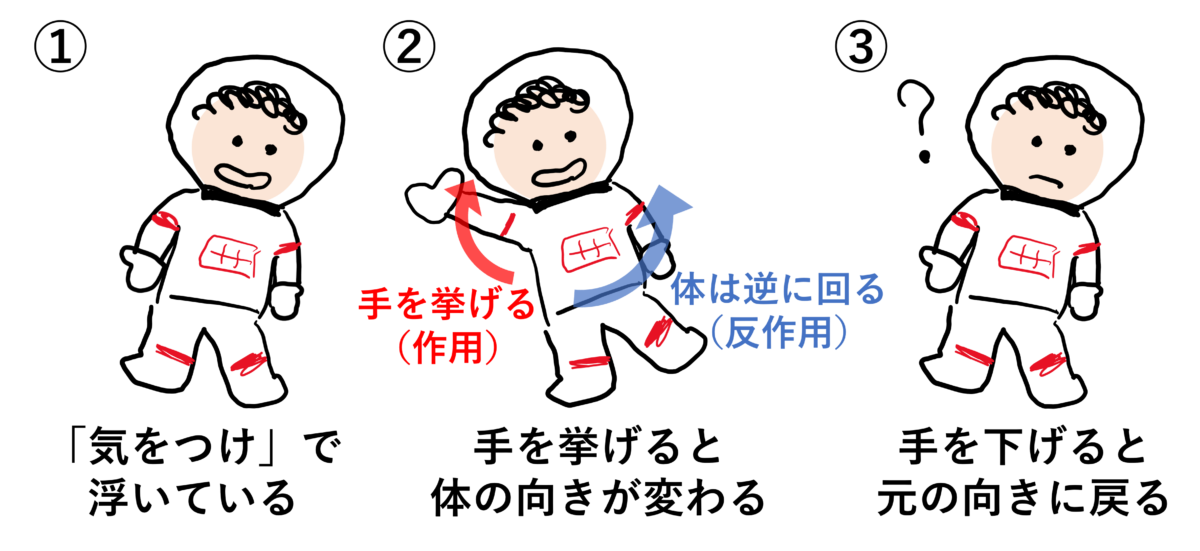なるほど、手足や胴体をうまく曲げたりひねったりすることで体の向きを変えていることが分かる。この姿勢運動の基本的な原理はいわゆる作用・反作用の法則に従っていて、たとえば下の図の①のように「気をつけ」で浮いている状態から、②のように手を挙げればその反作用で体は逆方向に回って向きが変わるというような仕組みになっている。