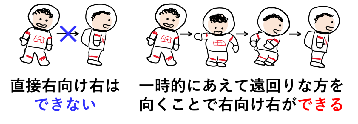 とまあ原理自体はさほど難しくないんだけれど、実はこの原理を使って自在に体の向きを変えるのはそう簡単ではない。たしかに図の①→②のように手を挙げれば一時的には体の向きを変えられるけれども、②→③のようにまたそのまま手を下げて「気をつけ」に戻ったら元の向きに戻ってしまう。同じように、「右向け右」をしようと腰をひねってみても、またそのまま腰を戻せば正面に向き戻ってしまう。体全体の向きを変えて「右向け右をした気をつけ」の状態になるには、単純に体をひねるのではなく、下の図のようにあえて一度遠回りな方を向いてから上手い手順で「気をつけ」に戻るというややこしい体の動かし方をする必要があるのだ。先ほどの宇宙飛行士の動画でも、よく見ると実はこのようなことをやっていたのだ。
