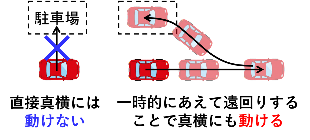 このような「宙に浮いた人が、とある『気をつけ』の状態から『右向け右をした気をつけ』の状態に移行する問題」は、実は自動車を駐車場に停める問題によく似ている。例えば縦列駐車をする場合、車は直接真横に動くことはできないけれど、一旦前に出てハンドルを切りながら下がると結果的に真横に動いて駐車できるのは日常経験からも分かるだろう。上の図と下の図を見比べると、「わざと遠回りすることで、動けない方向にも動ける」という似たような現象が起きていることが分かる。
