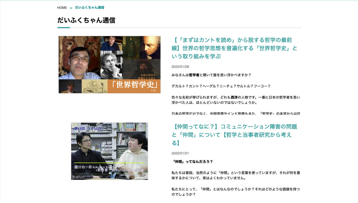 UTokyo OCWでも、だいふくちゃん通信という授業動画を紹介しているブログがあります。特にUTokyo OCWで公開されている正規の授業は長いものが多いので、こちらの記事で事前に内容を確認することで、興味のある動画をより効率的に探すことができるはずです。(あと、講義動画の内容が要約されてるので、記事を読むだけでためになったり。実はこの記事の筆者がこのブログを書いていたりします)