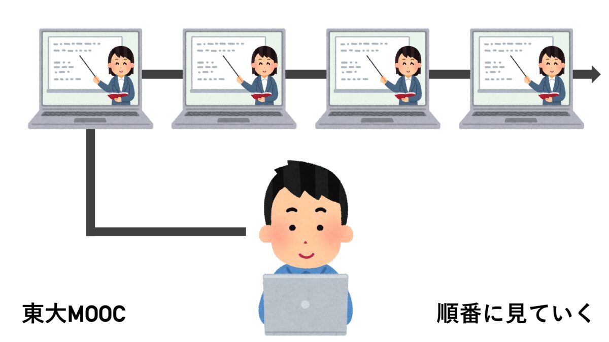 たとえばUTokyo OCWでも実際にコースとして開講された授業動画が公開されたりしていますが、個々の動画を自由に視聴できるUTokyo OCWでは、その受け方がMOOCと大きく異なるということですね。