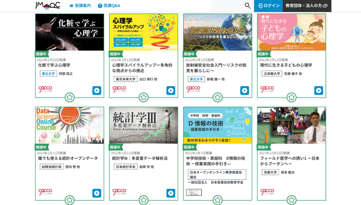 MOOCには世界中の大学がコースを提供しており、(語学堪能であれば)選り取り見取りで選ぶことができます。日本の大学がコースを提供しているJMOOCもあります。