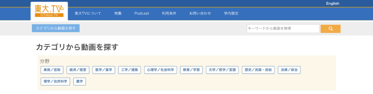 あと、東大TVでも同じく分野別に動画を調べることができたり、キーワードから検索をかけられるので、そこで教員別に動画を探すことができたりします。