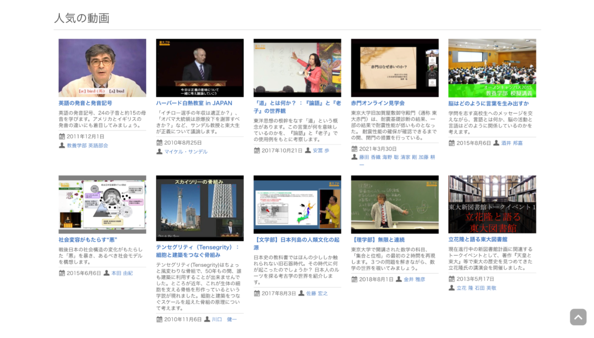 東大で開講された公開講座や講演会などの映像を無料で公開している。