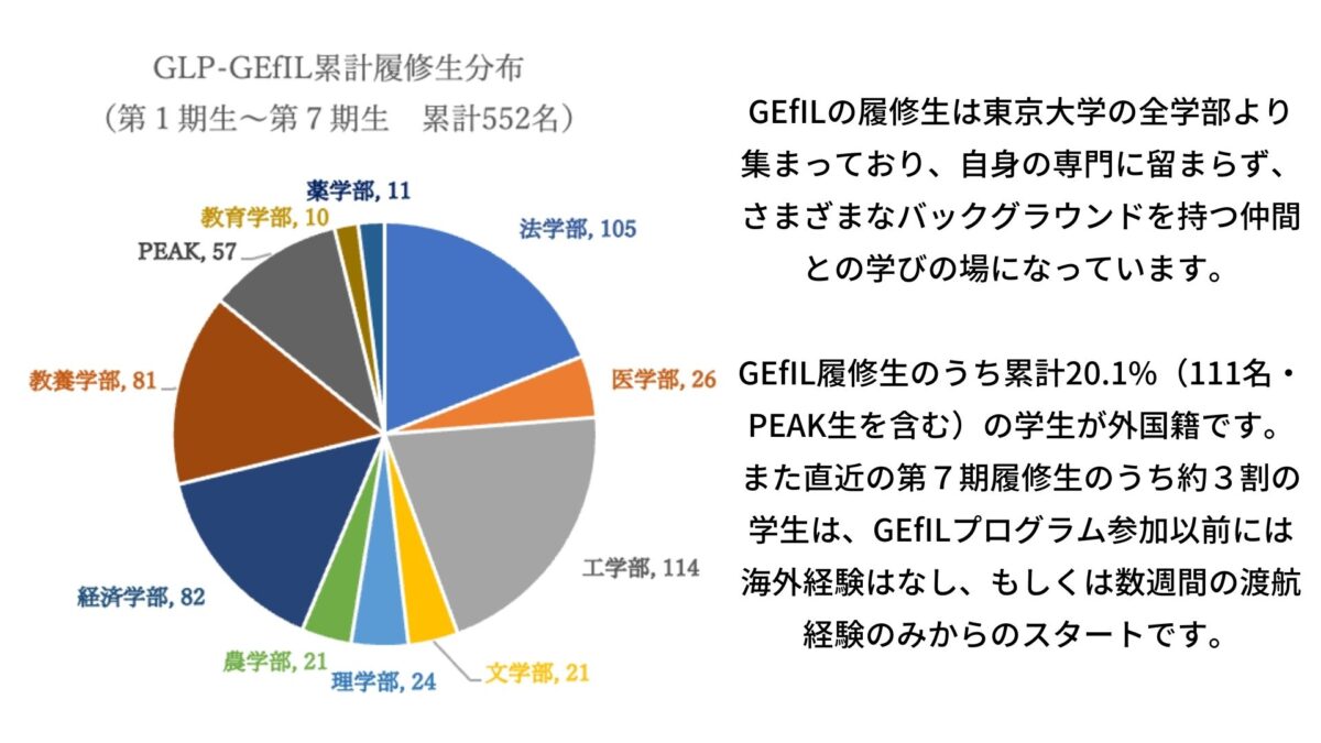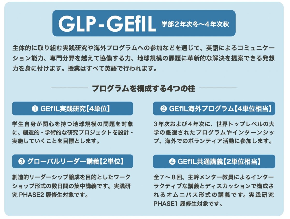 GLPとは、国際社会における指導的人材を育成することを目的に作られた、学部学生を対象としたプログラムのこと。GEfILはその中でも学部後期生向けの選抜プログラムです。