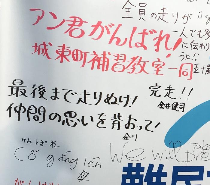 アンくんが諦めそうになった時には、金井くんが「完走できなかったら姫路に帰ってくるなって先生たちに言われてたじゃないか。走りきらないと姫路に帰れないぞ、先生や子どもたちが待ってるぞ」と声をかけた。