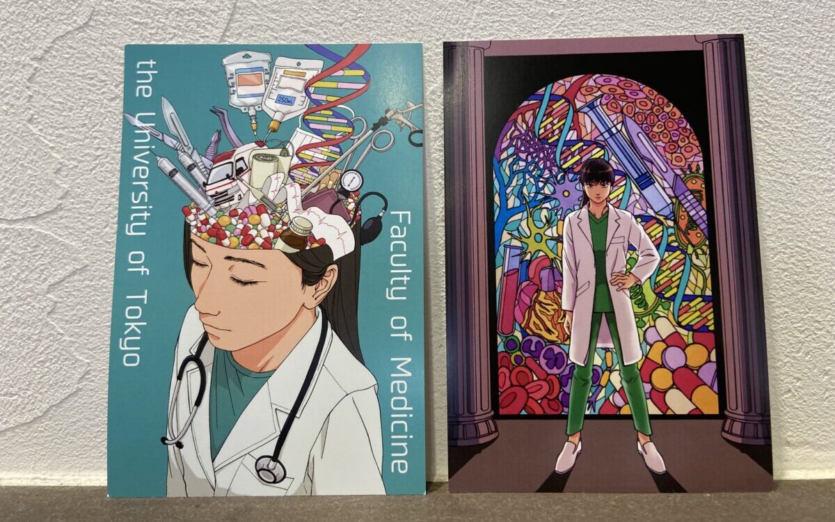 「クリアファイルとポストカードのデザインを担当しました。普段趣味で描く絵とは違って商品になるので、医療・医学のモチーフの描き込み、ステンドグラス風の加工など、細部にこだわりつつ全体の雰囲気の統一感を意識して描きました。ファイルについては裏面のデザインも気に入っているので、お手にとってお確かめください。文房具はいくらあっても困りませんし、全部ここでしか手に入らない限定グッズですから、ぜひ五月祭の思い出として手元に置いていただければ幸いです。」