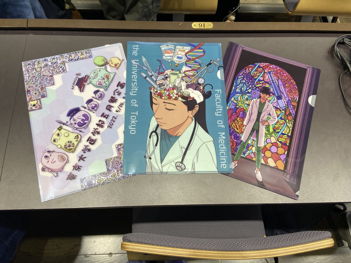 グッズのデザインを作成してくれた方、商品の発注をしてくれた方、たくさんの同期の力を借りて、医学部企画の限定グッズの販売にこぎつけることができました。限定グッズとしてはクリアファイルだけでなく、ノート、シャープペン、ボールペン、ポストカードを販売しております。いずれも満足のいく出来ですし、記念品として最適ですので、是非この機会にご購入をお願いします!」