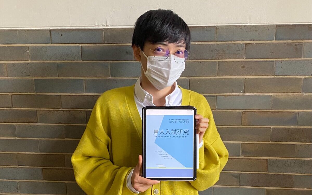 「受験本の取りまとめを行った堤といいます。受験本企画は毎年恒例の企画で、“東大医学部生が語る東大受験対策”と題して、主に受験生に向けて、東大二次試験を中心に入試全般についてわかりやすく解説した本になっています。各教科の対策法や、実際に学生が問題を解いて感想を書いたコーナー、再現答案などは毎年ご好評をいただいています。今年は共通テストの変化が激しかったこともあり、共通テストを受けた経験のある2年生にも協力してもらうなど、特に共通テストの分析に力を入れました。」