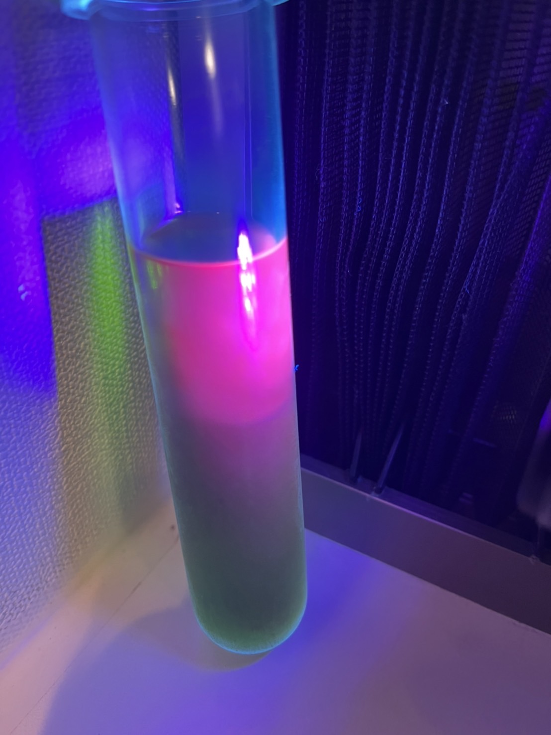 そこではちょうど別のスタッフがお客さんにガラス容器に入った淡い黄緑色をした液体を見せていた。その容器を蛍光灯のような器具の上に置いた瞬間、液体が鮮やかな緑色に光った!その急激で美しい変化に、思わず来場者の間で感嘆が漏れた。これがイメージング技術なのだという。