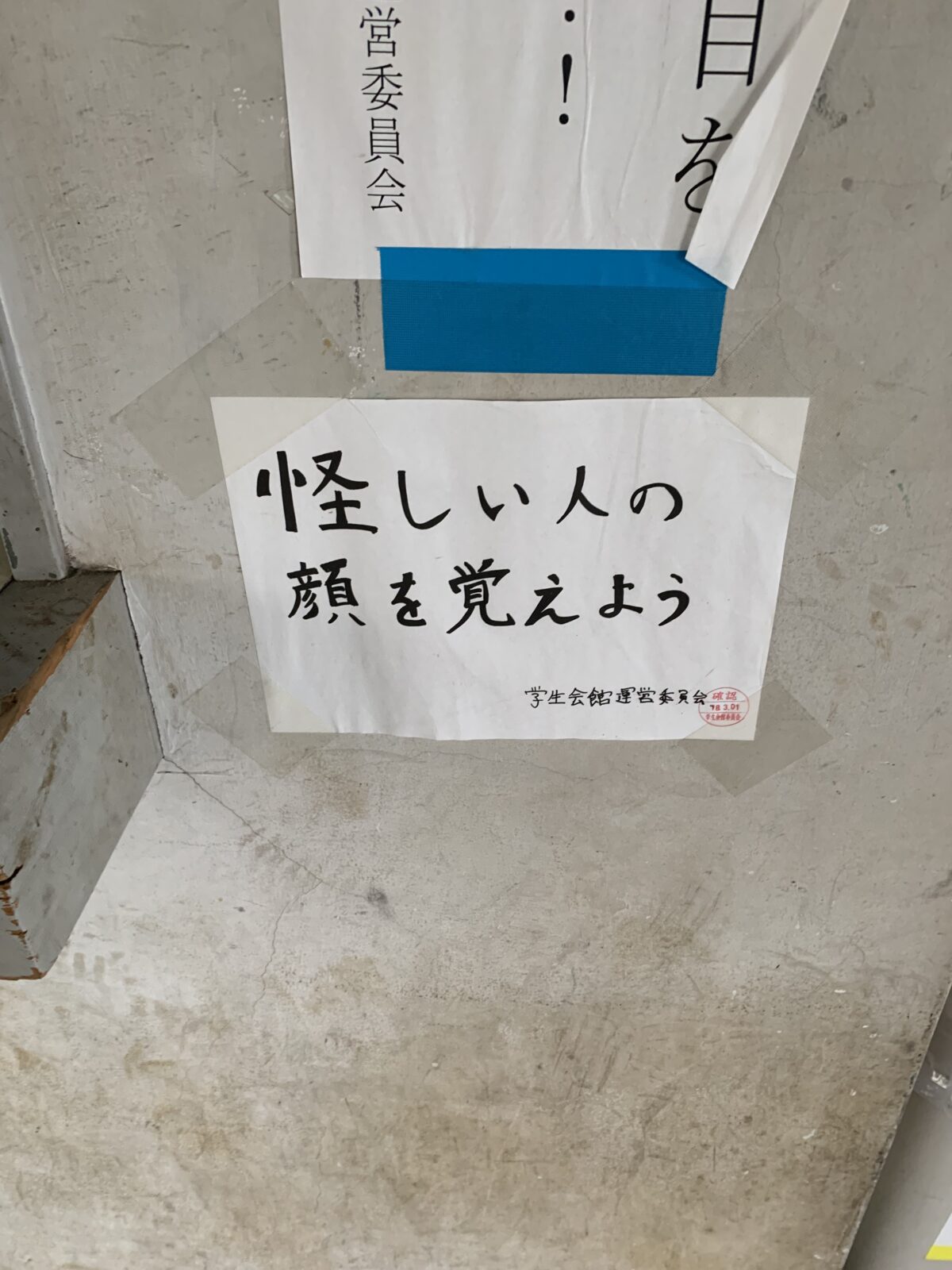 さらに、我々(一人だけど)探検隊は、利用者へのインタビューを敢行することにした。いったいどんな人が好き好んで「新」のほうを使うのだろうか…と気になったのでインタビューをしてみたいと思ったのだが、どうも学生会館か新学生会館かは活動1回毎の抽選で決まるらしい。なーるほど。「新学生会館大好き!いつも使ってるから実家のような安心感!毎日抱いて寝てます!」みたいな人はいないわけだ…まあ、それでも、会館の使用感についての所感は聞かんといかんので、インタビューを敢行することにする。