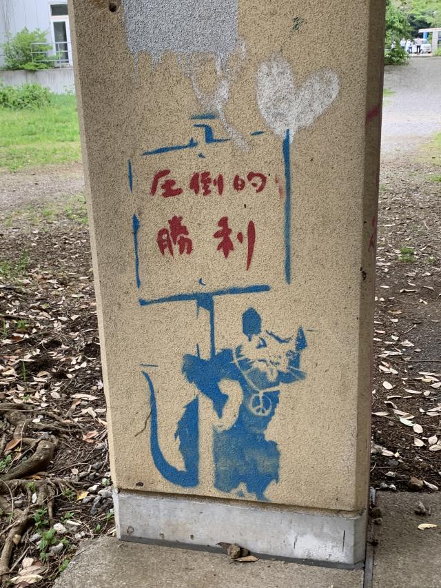 なんとバンクシーが東大にも来ていた(かもしれない)のである!さすが日本最高峰の大学である。急行が通過する日本最高峰の大学である!東大生たちよ、非暴力・反戦争・反権威主義・京王井の頭線の輸送力改善ならびに駒場東大前駅への急行停車をかかげて、今日も学生運動に励むのだ!戦争、反対ーっ!急行を、停めろーっ!ワーワーワー!