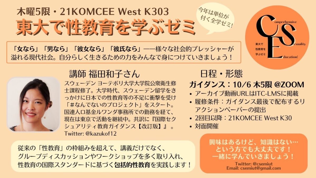 なお、「東大で性教育を学ぶゼミ」は2022年度は単位の出る主題科目として開講が決定しています。ゼミ選びに迷っている方の参考にもぜひ!