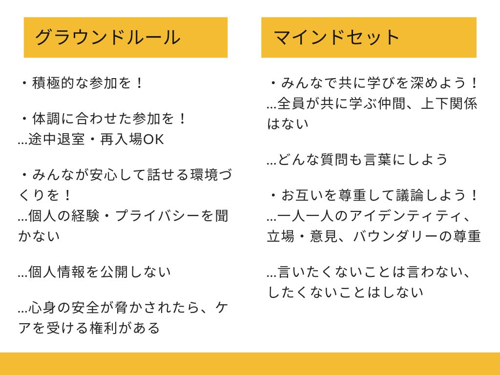 あとは、4日間通して私たちがすごく大切にしていたのが、グラウンドルールとマインドセットというものなんです。