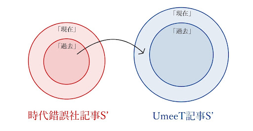 ここで集合「記事S」を拡張することでこの問題を解消する。時錯記事Sにこれから恒河沙223号に投稿されるUmeeT記事M、またUmeeT記事SにUmeeTに投稿されるこの時錯記事Mを含めることで「時錯記事に対応するUmeeT記事」を生み出すことが可能となる(以降このような記事を「記事S’」と表現する)。これはこれまで記事Sには過去の元しか含まなかったものを、現在の元を含むように拡張すると換言される。目的の章に書いたように、今回の記事は時錯及びUmeeTでの長時間の議論を経て選択されたものである。その議論を通して我々は記事に『専用』の属性を付与した、と表現することも可能である。