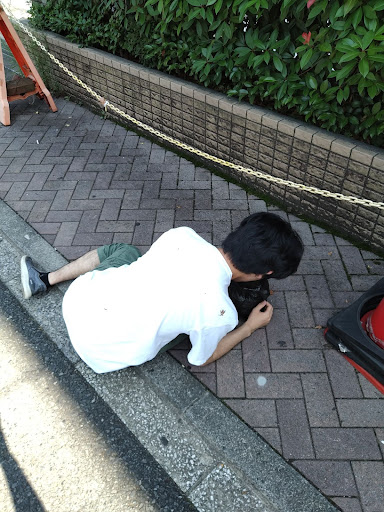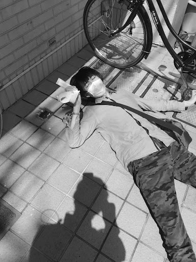 このままでは我々が極秘に仕掛けておいた【うんこうん太郎】のソレに社員が引っかかってしまう。ということで立って進むということをルールに追加した。一番最初に出てきた我らが期待の新入社員【浮浪】はというと、なんと道端で休んでいた。