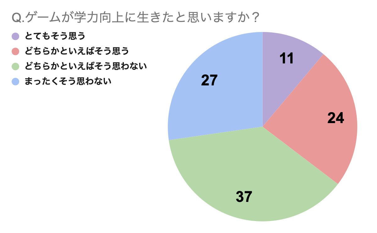 といった固定観念が存在しうることを考えれば、3分の1の人が「ゲームが学力向上に生きた」と考えているということは、我々ゲーム愛好家にとって、重要な価値を持つデータなのではないでしょうか?