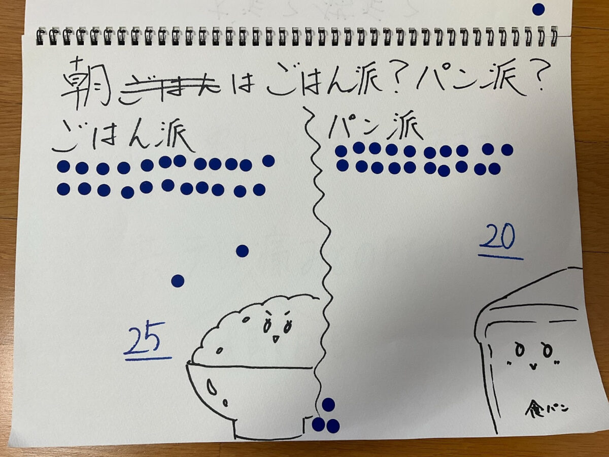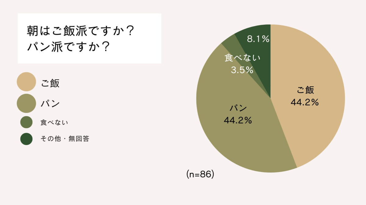 フォームでの調査ではご飯とパンが完全に同数で引き分けとなった一方、キャンパスでの調査ではご飯派が若干優勢となりました。その他には「シリアル」「グラノーラ」「スープ」などの回答も。