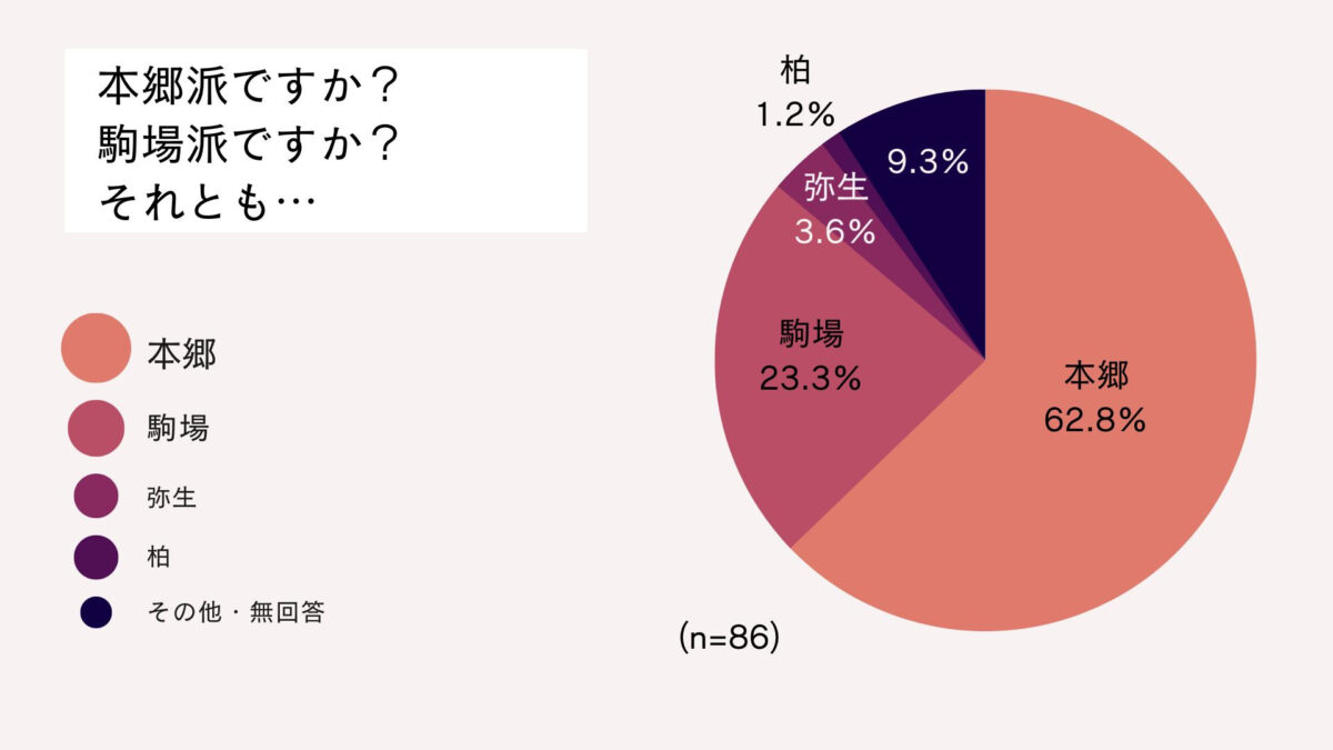 自分の所属してるキャンパスを贔屓にするものかなと予想していましたが、思ったより本郷推しが多い結果に。弥生と柏は所属人数に比例してか、少数派でした。