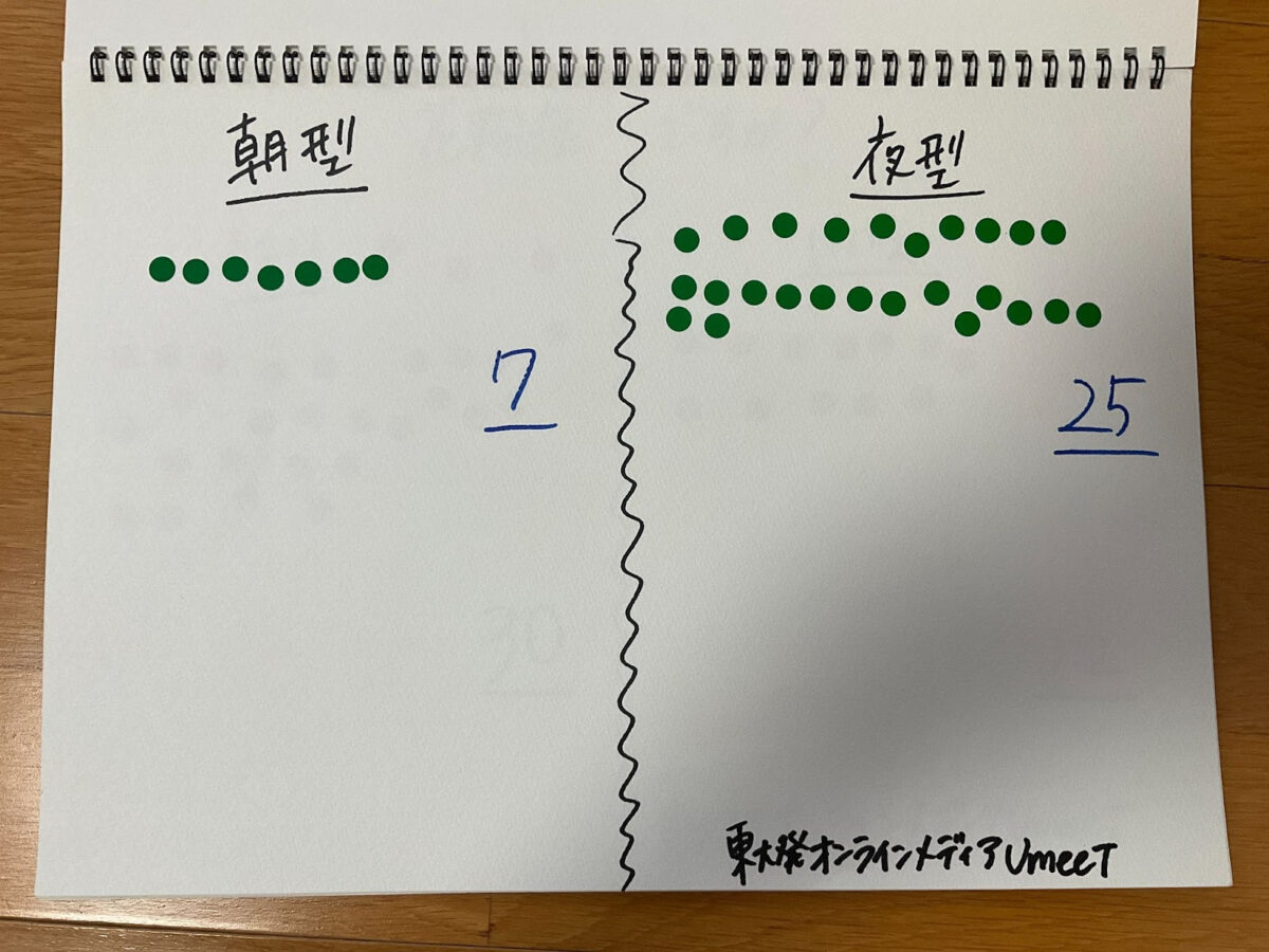 受験が終わった直後の1年生が多い中でのこの結果、東大受験生には夜型が多いことを示しているのかもしれません。