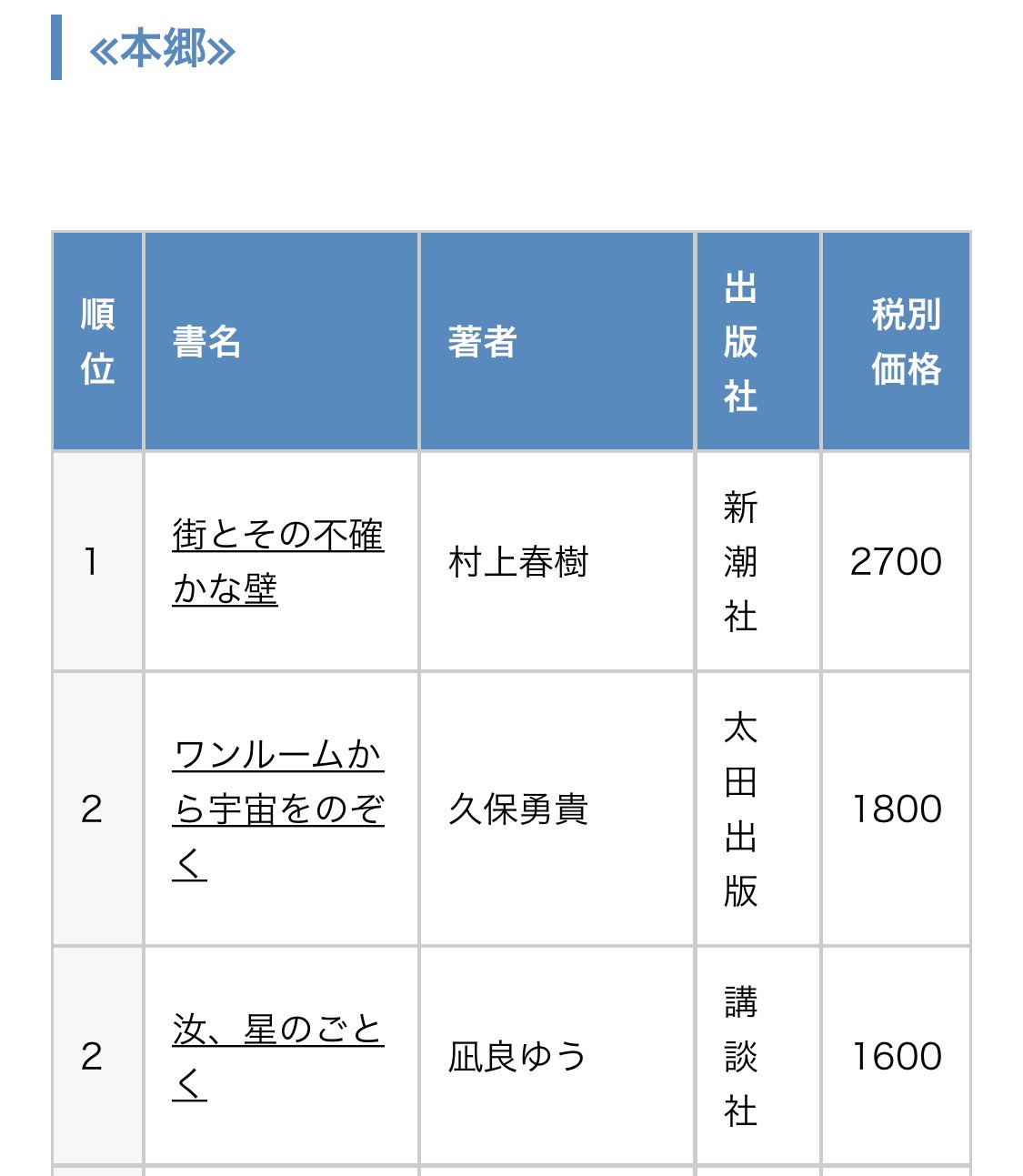 > 1位 村上春樹 <