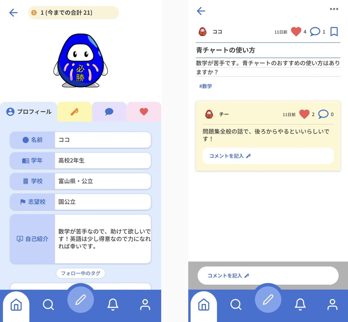 A.まずは機能設計の段階で、どのような機能に需要があるのか、どうしたら高校生に長期的にってもらえるアプリになるのか考えるのに物凄く苦労しました。受験生用のSNSって、あるようであまりないアイディアで、調べても成功しているものはあまり見つかりませんでした。どうすればより多くのユーザーに使ってもらえるのかをよく考え、ゲーミフィケーション(※ゲームのデザインや仕組みをゲーム以外の物事に応用すること)を取り入れたりしました。投稿を積極的にすればするほどコインが貯まり、「はぶるん」という公式キャラクターの着せ替えが出来る機能です。これによりユーザーの継続した利用を促しています。このキャラクターのデザインにもかなり悩み、失敗作もたくさん作って考え抜きました笑