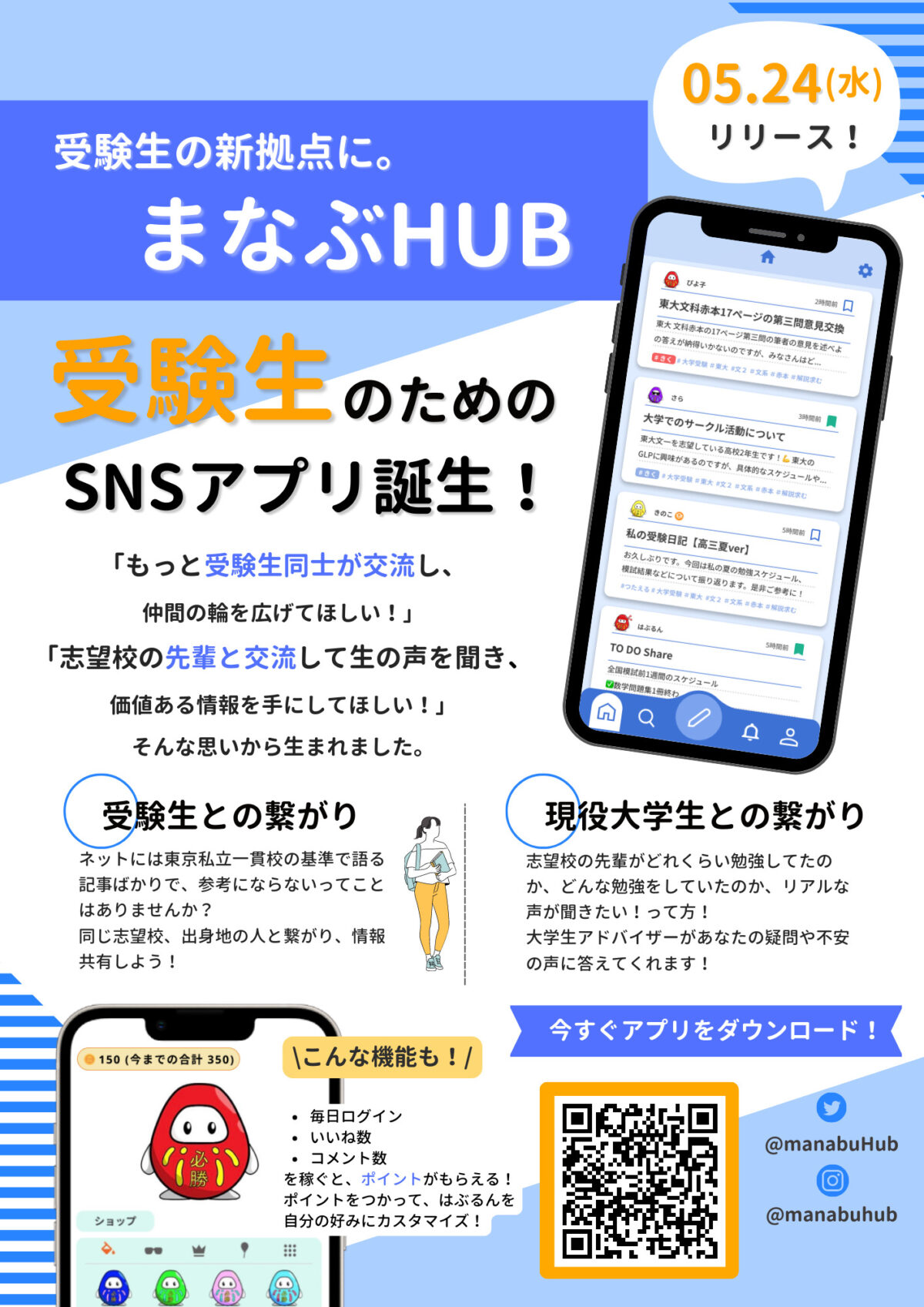 「まなぶHUB」というのは、受験生のためのSNSアプリです。まなぶHUBでは、受験生同士で情報をやりとりしたり、大学生が高校生に向けて大学生活や受験について発信したりすることができます!使えば使うほどコインが貯まりアバターの着せ替えができるなど、ユニークな機能を持つ面白いSNSです。