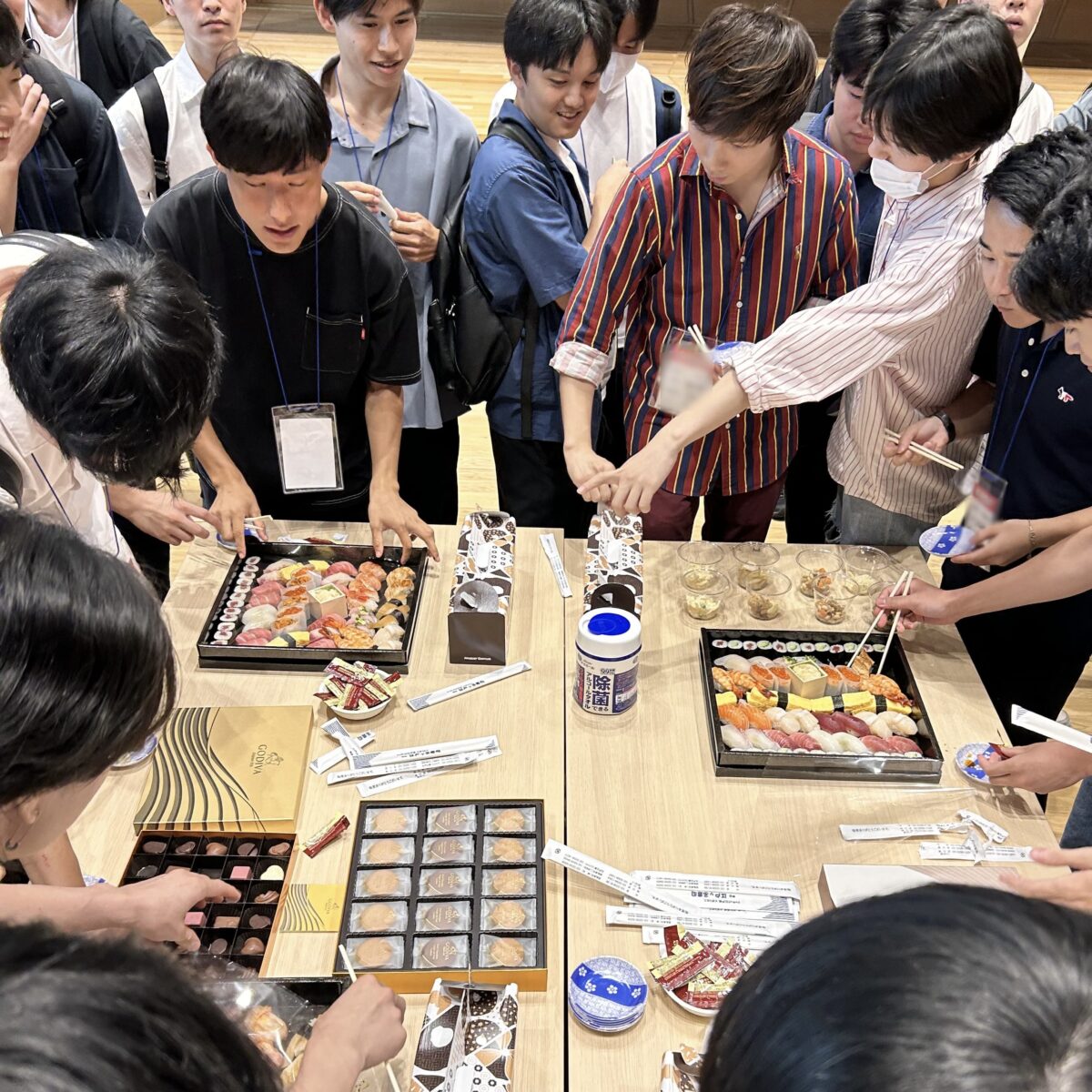 お寿司だけではなく、ゴディバやミスドなどの豪華なお菓子・おつまみも充実。すごいラインナップです。ここだけ見ると就活イベントとは思えない……