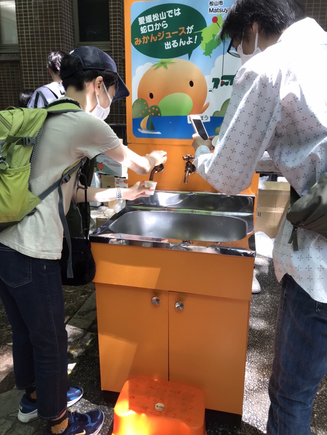 他には学祭でのみかん関連の物販のほか、「蛇口からみかんジュース」(蛇口から出てくるスタイル!毎年行列ができています)販売、柑橘の勉強会、みかんを使った実験、小学校での出張授業、スイーツ巡りなど、幅広く活動しています。会員は290人ほどです。