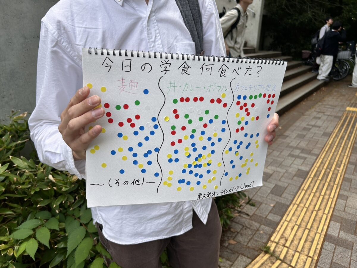 ということで、駒場生の皆さんに学食への新鮮な感情を取り戻してもらうため、「学食出口調査」なるものを実施してみました。方法は非常にシンプルで、駒場の学食から出てきた人に今何を食べてきたかを聞くというもの。実に303人もの方に投票していただきました。ご協力ありがとうございます。