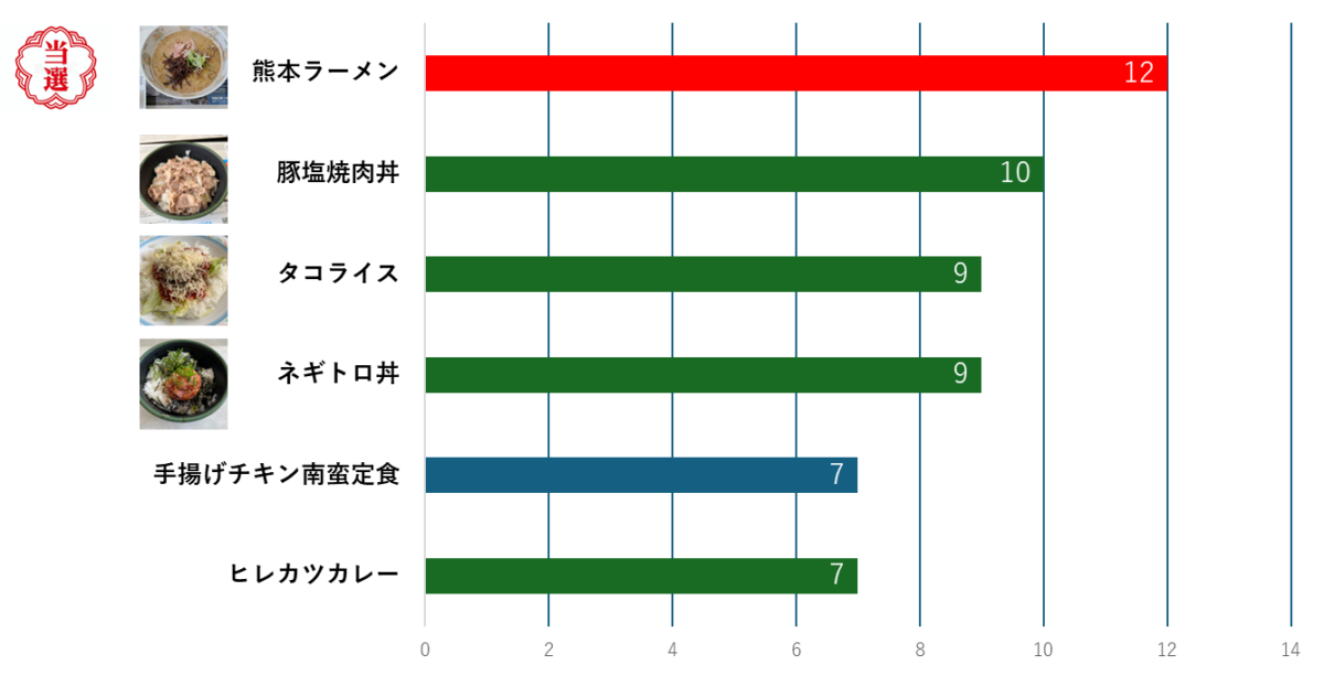 麺部門の不人気を跳ね返し、見事熊本ラーメンが一位を取りました!以下、一位から同率三位までの4メニューの食レポをお送りします。