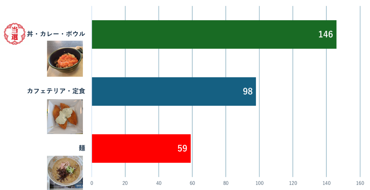 大方の予想通り、丼・カレー・ボウルが146票を得て1位に。当選確実(?)です。やはり多様で彩り豊かなメニューが人気を集めました。後述する個別のメニューを見ても、色々なメニューがまんべんなく食べられていて、その盤石さがうかがえますね。