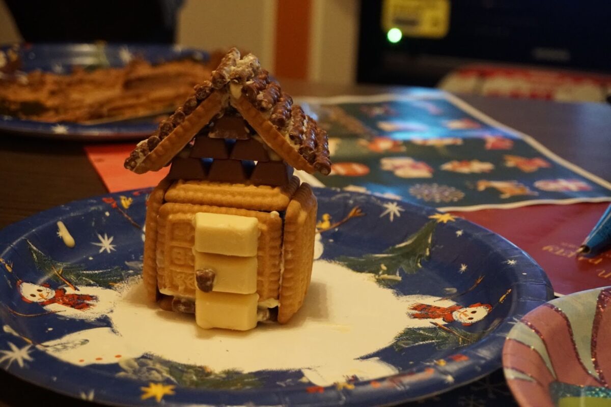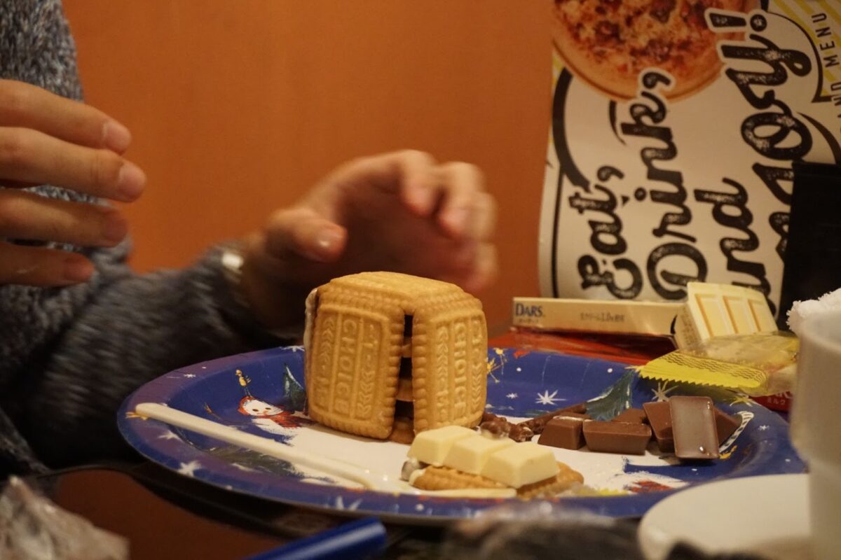 できてきました!ちなみに、本来は溶かしたチョコの接着部分を冷凍庫で冷やし固めながら作るのですが、カラオケに冷凍庫など当然ないので、保冷剤をお皿の下に敷いて、部屋は冷房をつけるという力技で解決です。クリスマスに冷房…!?