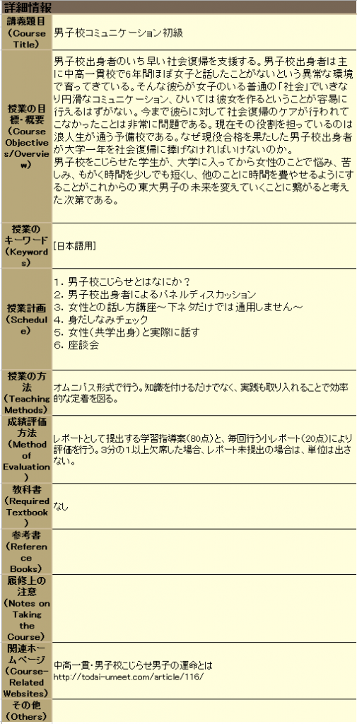 その名も「男子校コミュニケーション初級」。