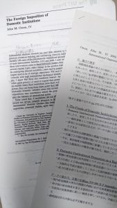 私はイカ東ぶりを発揮し、ゼミで二つの論文を担当した。ここで紹介するのは、一つ目の論文について。テーマは、「自国の政治体制を他国に押し付けること」(写真は筆者担当の論文&レジュメ)。